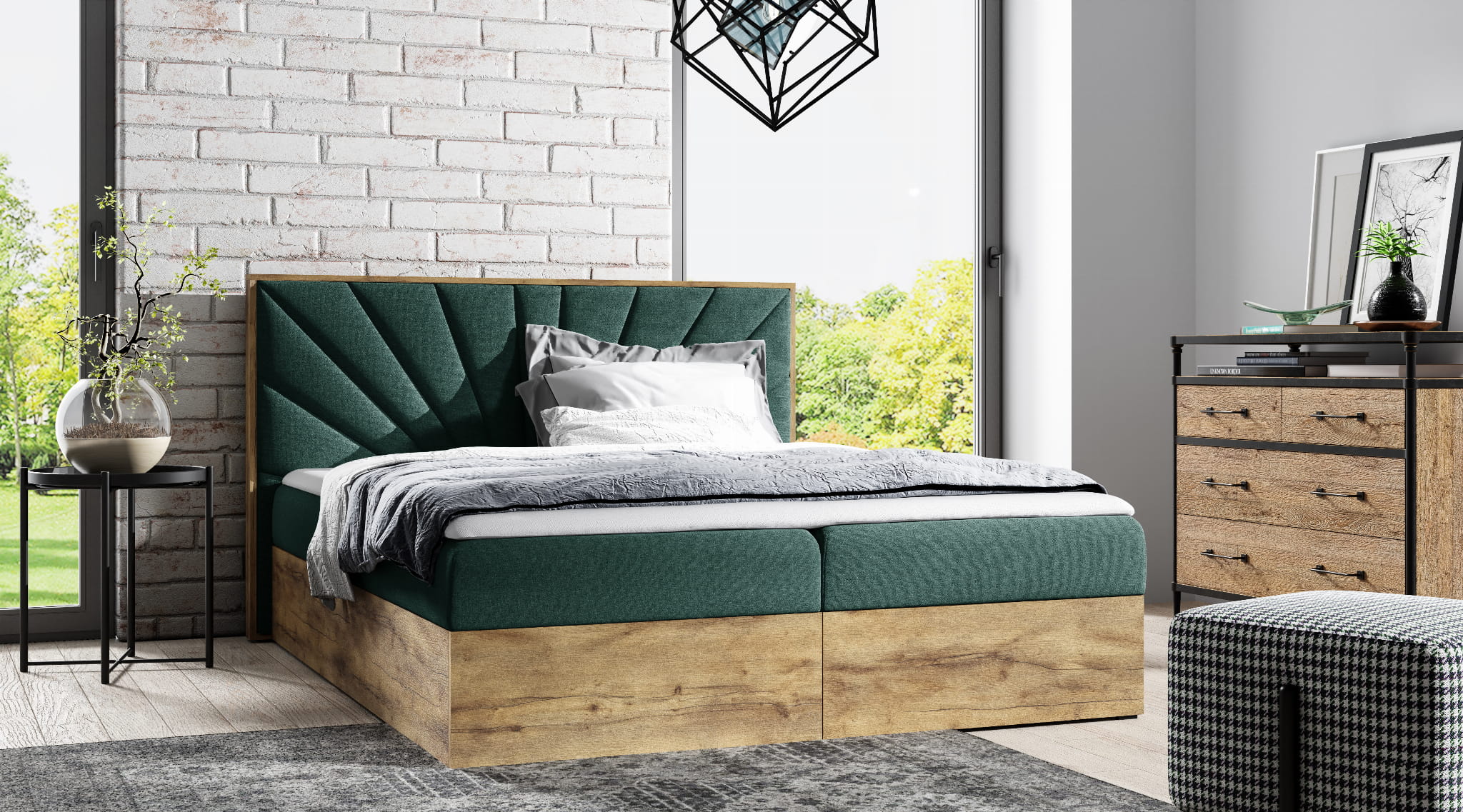 Erleben Sie die perfekte Harmonie aus durchdachtem Design und höchster Funktionalität! Das Boxspringbett WOOD VII in 140x200 cm ist das ideale Doppelbett für kompakte Schlafzimmer, anspruchsvolle Einzelschläfer oder als exklusives Gästebett. Es zieht mit seinem 103 cm hohen, raffiniert gesteppten Polsterkopfteil alle Blicke auf sich. Der ansprechende Mix aus weichen Bezugsstoffen und pflegeleichter, laminierter Platte im Holzdekor Eiche Wotan verleiht Ihrem Zuhause ein zeitgemäßes, skandinavisch inspiriertes Wohlfühl-Ambiente.