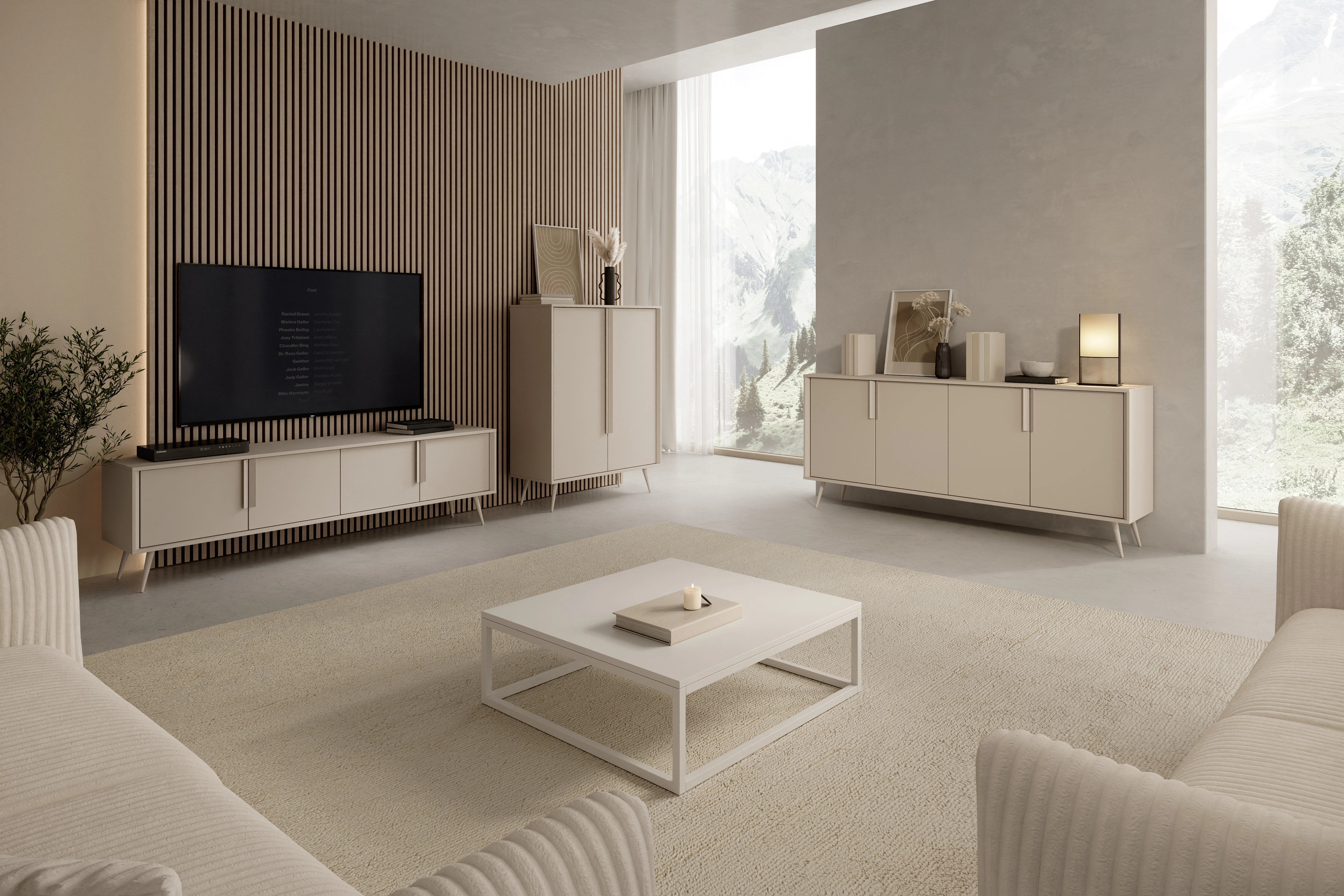 Die Kollektion MAVERA ist die perfekte Wahl für alle, die eine ruhige, entspannende Ästhetik mit einem modernen Touch und einer Prise Originalität suchen. Dieses beeindruckende, über 186 cm breite TV-Lowboard besticht durch seinen subtilen Farbton in Kaschmir, der perfekt mit der minimalistischen Form und den schlanken, hohen Beinen harmoniert. Dank der raffinierten Details präsentiert sich dieses Multimedia-Möbel leicht, modern und absolut zeitlos.
