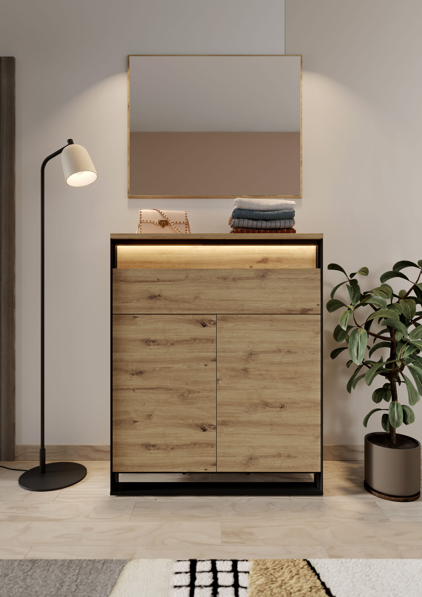 Suchen Sie nach dem perfekten Accessoire, um Ihren Eingangsbereich nicht nur optisch aufzuwerten, sondern auch funktionaler zu gestalten? Der großzügige Flurspiegel aus der Kollektion QUANT ist die ideale Lösung! Eingefasst in einen eleganten Rahmen in der warmen Holzoptik Artisan Eiche mit schwarzen Details, fügt sich dieses Modell nahtlos in moderne, klassische oder industrielle Einrichtungsstile ein und bildet die perfekte Ergänzung zu den Kommoden und Sitzbänken der QUANT-Serie.