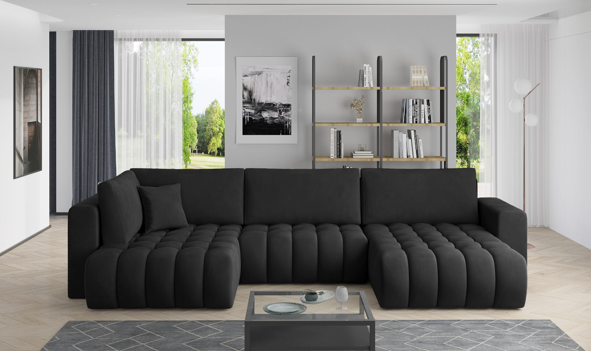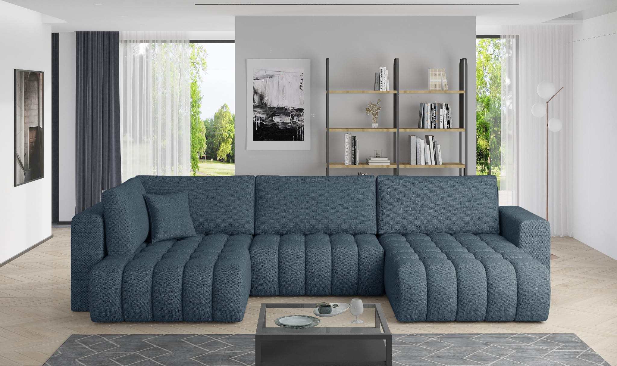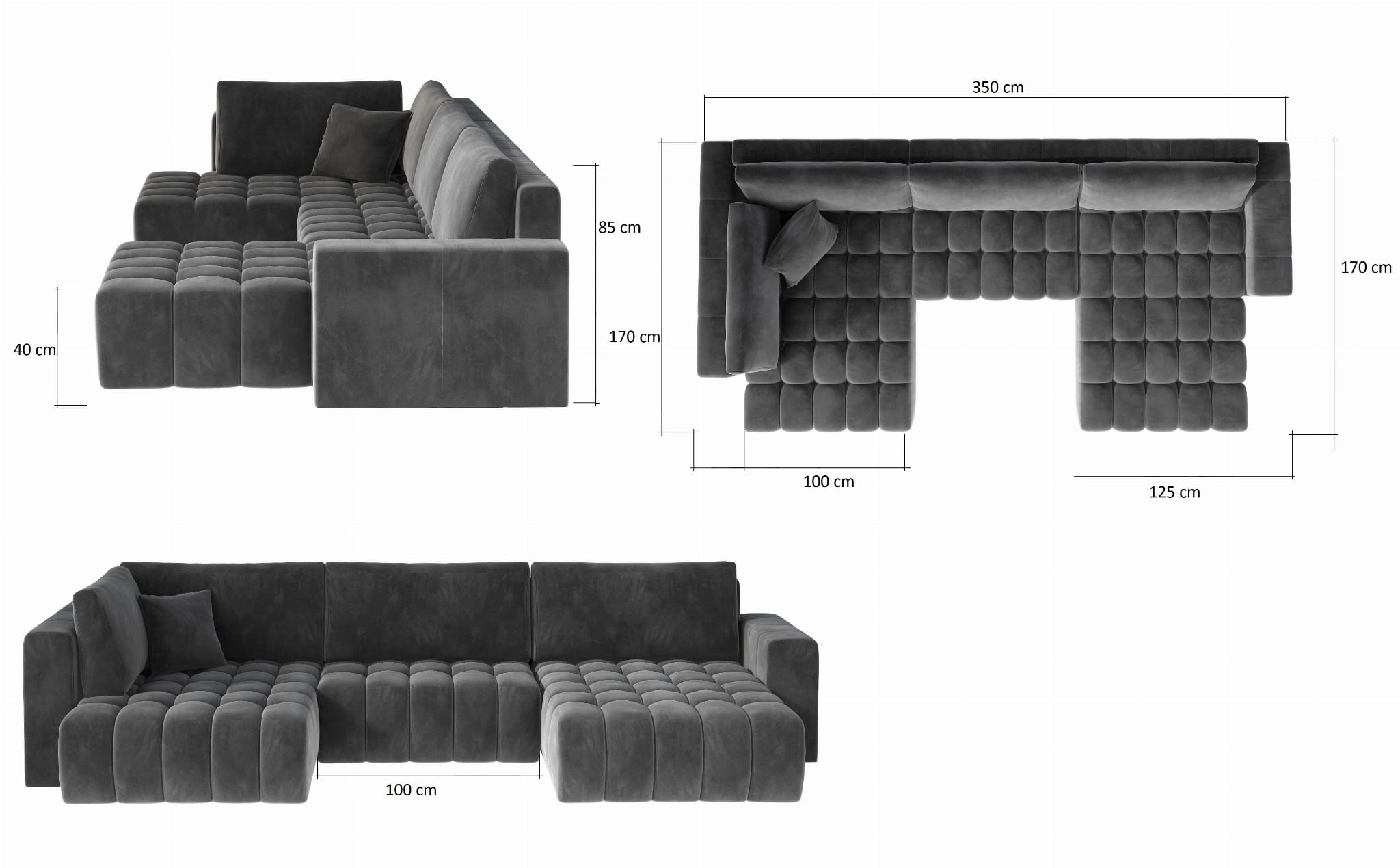 Die Ruhefläche für den Tag beträgt 350 x 170 x 85 Zentimeter, für die Nachtruhe sogar 300 x 120 Zentimeter. In einem solchen Raum kann man sich wirklich entspannen! Neben den Maßen unseres einzigartigen U-förmigen Möbelstücks ist auch der Komfort zu erwähnen, den es zu bieten hat. Sowohl die Sitzfläche als auch die Rückenlehne unseres Bonito bestehen aus innovativem, hochelastischem HR-Schaum, sowie T25-Schaum, der schnell auf Veränderungen unserer Position reagiert und sich dadurch sowohl im Sitzen als auch im Liegen oder Schlafen besser an unseren Körper anpasst .