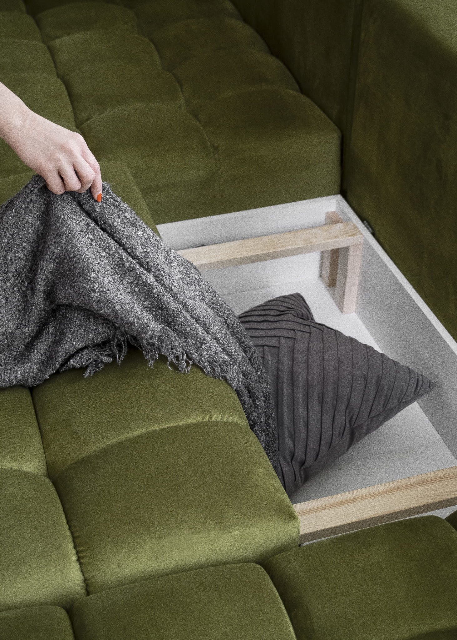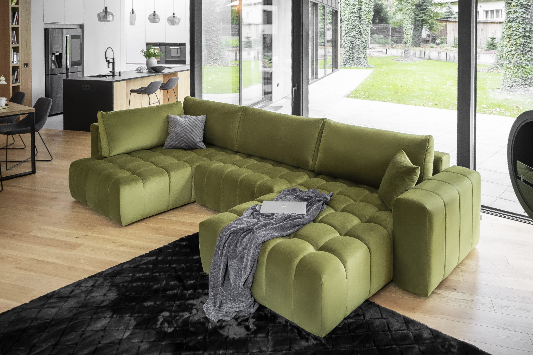 Bonito ist eine einzigartige Wohnlandchaft von beachtlichen Ausmaßen, die einerseits als Hauptelement Ihres Interieurs und gleichzeitig das Herzstück des Wohnzimmers dient, und andererseits ein hochfunktionales Möbelstück mit a Schlaffunktion. Die Verwandlung einer gemütlichen Wohnlandchaft in ein sehr großes und bequemes Bett mit einem geräumigen Bettkasten ist einfach und intuitiv, da dies über den DL-Mechanismus erfolgt.