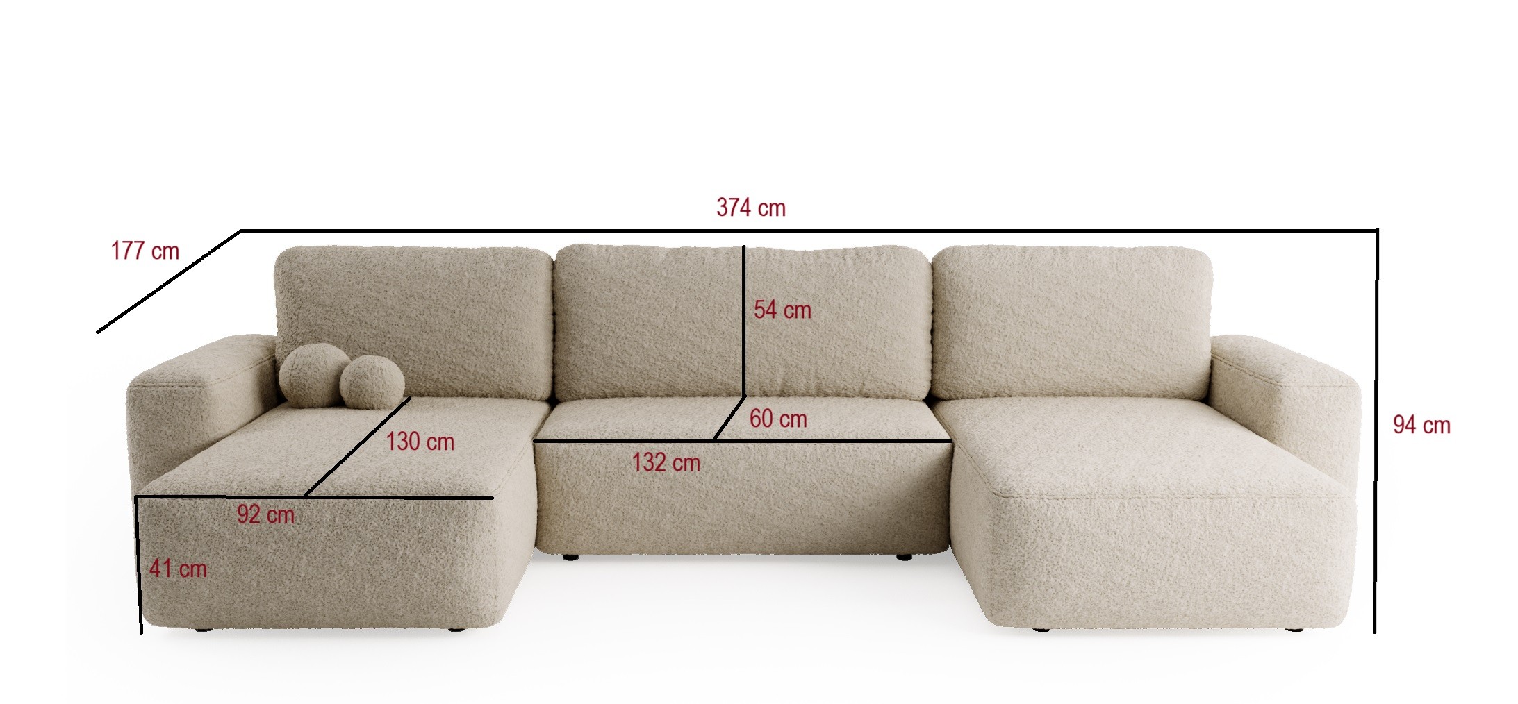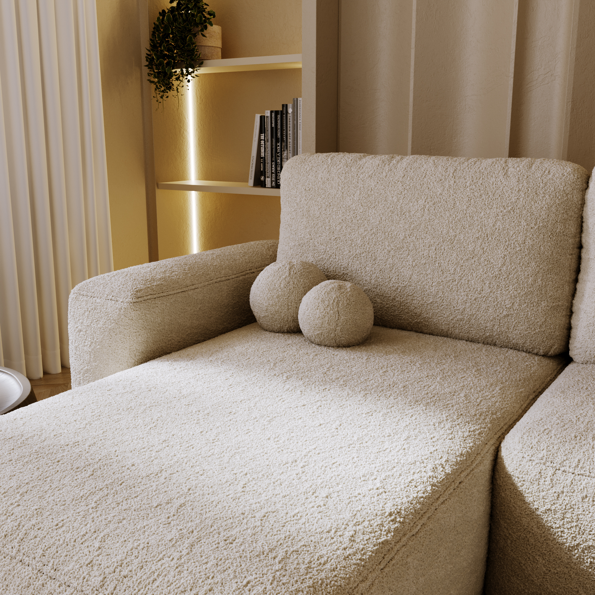Die Wohnlandschaft Nola U ist die perfekte Lösung für geräumige Wohnzimmer und bietet Platz für die ganze Familie. Dieses imposante U-Form Sofa besticht durch seine moderne Ästhetik und den angesagten Bouclé-Bezug, der Wärme und Gemütlichkeit ausstrahlt. Ein besonderes Highlight sind die zwei dekorativen Kissen in Ballform, die dem Sofa einen einzigartigen, trendigen Charakter verleihen.