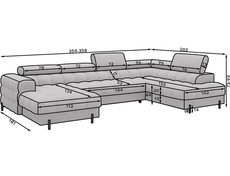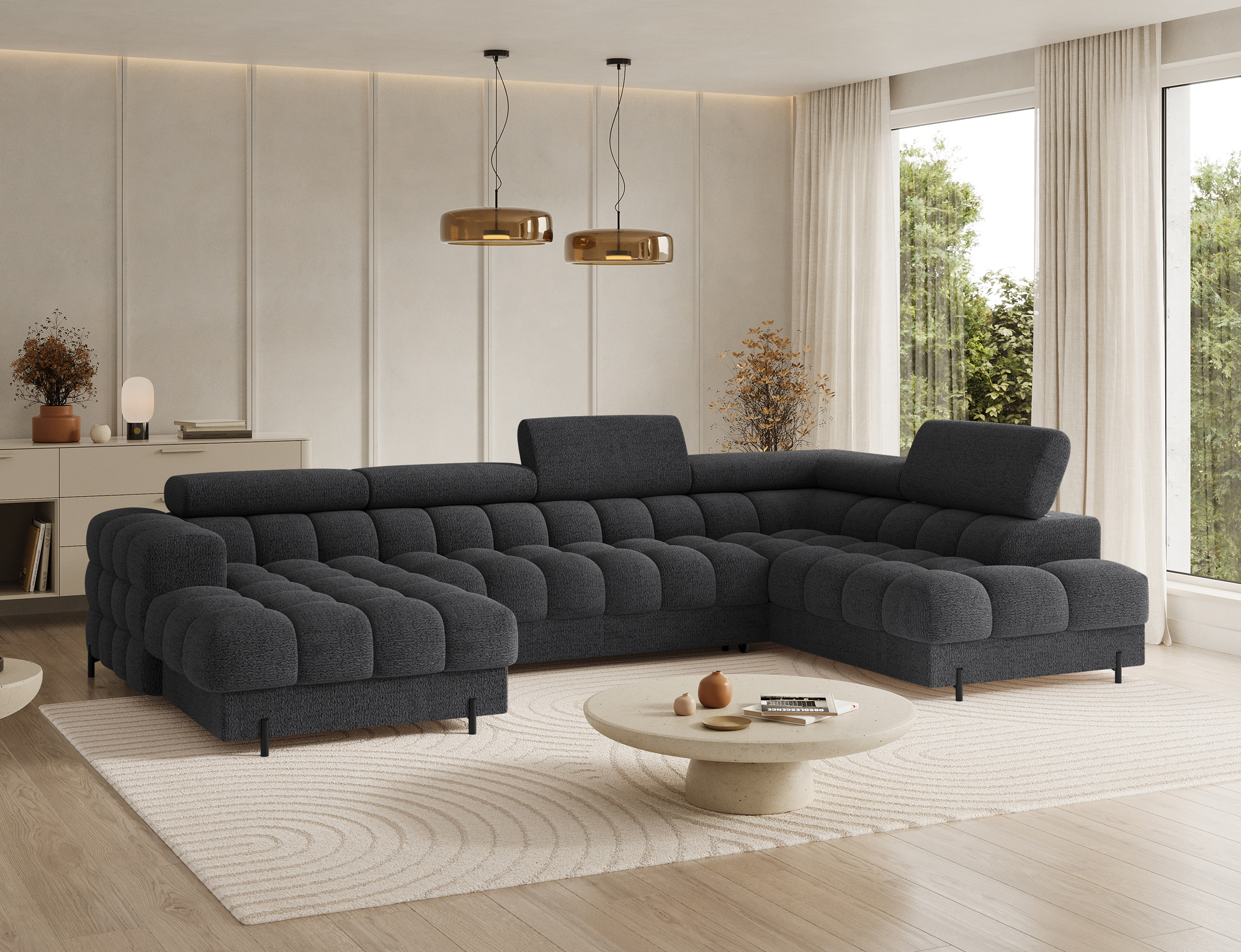 Verwandeln Sie Ihr Wohnzimmer in eine echte Wohlfühloase. Die Wohnlandschaft FERIA in großzügiger U-Form bietet nicht nur maximalen Platz für Familie und Gäste, sondern überzeugt auch durch intelligente Funktionen. Das Design besticht durch moderne Eleganz, unterstrichen durch stilvolle Steppungen und schlanke Metallfüße.